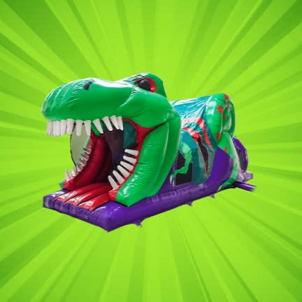 Designed to look like a scene straight out of Jurassic Park, our Dinosaur 3D Assault Course features a large 3D T-Rex mouth entrance and a slide exit.